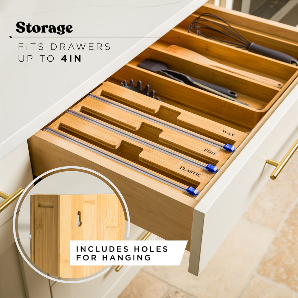 Say goodbye to kitchen clutter and disorganized drawers with our 3-in-1 Wrap Organizer with Cutter and Labels. Designed to make meal prep easier and more efficient, this all-in-one solution brings organization and convenience right to your countertop.